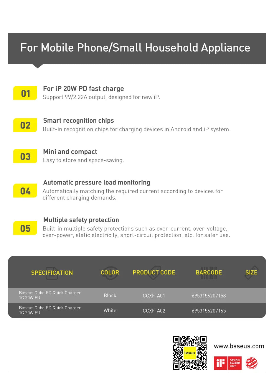 Suporta saída 9V/2,22A 20W e fornece carga rápida USB PD para Apple.