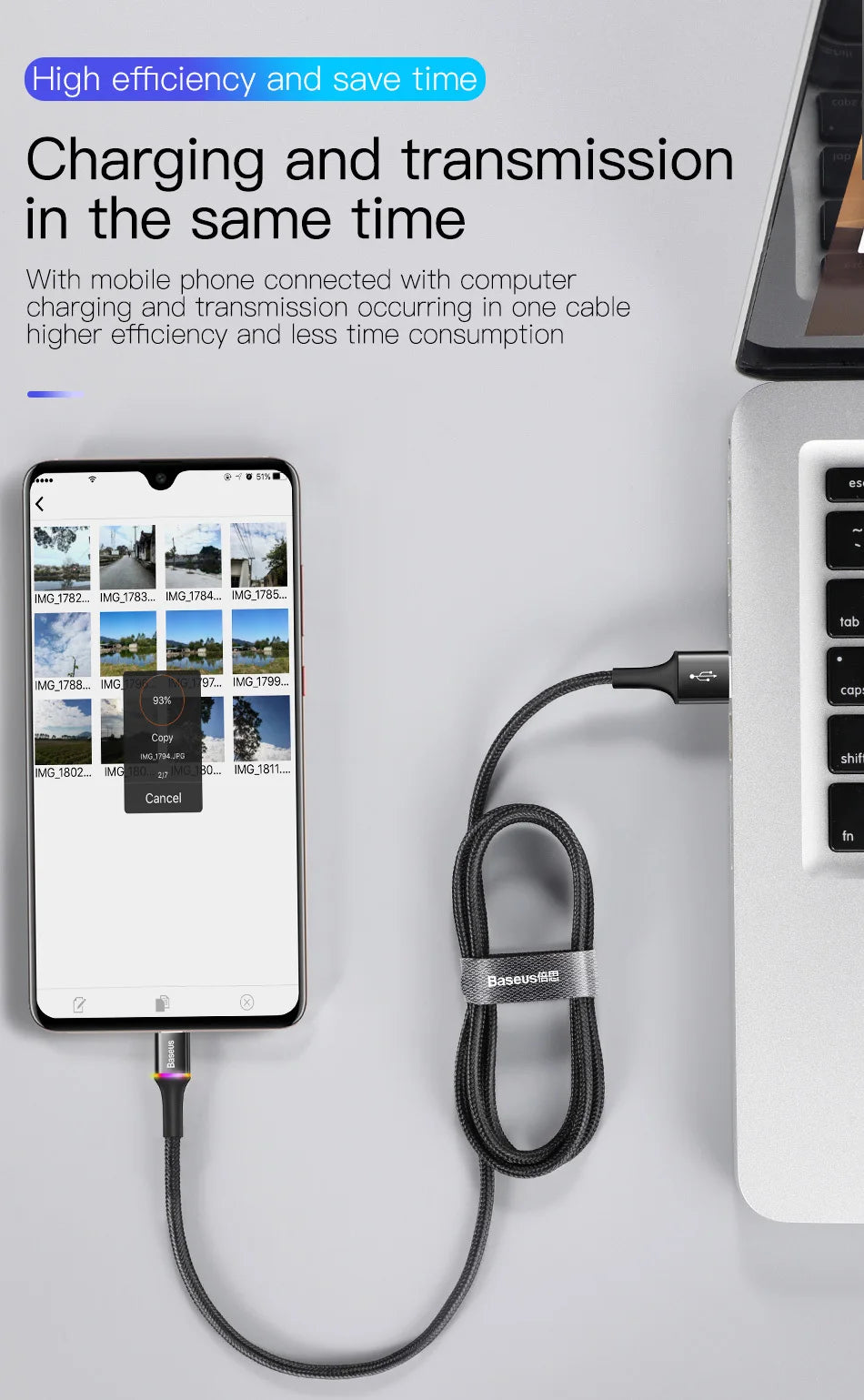 Baseus led usb tipo c cabo para xiaomi 13 redmi realme poco cabo de fio de carregamento rápido USB-C carregador do telefone móvel usbc tipo-c cabo